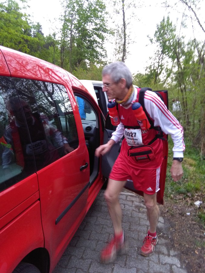 Alle 15-30 Kilometer sind immer sehr gut ausgestattete Verpflegungsstationen aufgebaut. Da aber ein Support laut Teilnahmebedingung Pflicht ist, hat sich Dori netterweise bereit erklärt, diesen zu übernehmen. Wir vereinbaren, dass Sie versucht, mich immer irgendwo zwischen den Verpflegungsstationen zu treffen. Mit dem mitgeführten Ortungs-GPS auf dem Handy klappt das auch immer sehr gut. Ich bin froh, dass ich mich ad hoc für das langärmelige Bayern Trikot entschieden habe, denn es ist ungemütlich kühl, aber wenigstens ist es noch trocken. Auch meine uralten FC Bayern Fleece Handschuhe sehen nicht nur gut aus, sondern sind auch sehr nützlich. Die ersten zig Kilometer werden abgespult. Die Muskulatur im rechten Bein macht weiterhin Probleme. Seit Boston ist es leider nicht besser geworden. Ich habe Bedenken, dass wenn es schlimmer wird, ich ein Zeitproblem bekommen könnte. Irgendwann zwischen Kilometer 60 und 70 Kilometern fällt mir auf, dass ich keine Probleme mehr im Bein habe. Rausgelaufen? Hoffentlich bleibt das so! Gegen 17:30 Uhr erreiche ich den Checkpoint VP82 bei Kilometer 82 in Arnsberg. Hier warten die 100-Meilen Läufer auf Ihren Start. Ich ruhe mich ein wenig aus, erledige ein paar wichtige Dinge und nach 20 Minuten bin ich wieder auf der Strecke. Als ich 20 Kilometer später den Checkpoint VP102 bei Menden erreiche, kalkuliere ich mal grob durch, wann ich bei meinem derzeitigen lahmen Tempo das Ziel erreichen würde. Ich nehme also die Zeit für die letzten 20 Kilometer und multipliziere sie mit 6,5 für die letzten 130 Kilometer. Mit Schrecken stelle ich fest, dass ich das Zeitlimit um einige Stunden überschreiten werde wenn ich in diesem Tempo weiter laufe und keine Pausen mehr mache. Ich rechne hin und her. Das kann doch nicht sein! Ich war doch nicht soooo langsam! Irgendwo muss ein Fehler in meiner Rechnung sein. Ich will schon fast Dori anrufen, dass Sie mich abholt, da ich keine Lust habe noch zig Stunden durch die Nacht zu eiern, wenn ich eh null Chancen habe, das Ziel im Zeitlimit zu erreichen. Ich bin ziemlich deprimiert. Endlich fällt mir der Fehler in der Rechnung auf. Ich bin davon ausgegangen, dass ich den Checkpoint VP82 um 16:50 Uhr verlassen habe. Stattdessen habe ich ihn aber erst um 17:50 Uhr, kurz vor dem 100-Meilen Start verlassen. D.h., ich habe mit einem Schlag 6 Stunden "gespart" und bin nun wieder fett in der Zeit. Mir fällt ein Stein vom Herzen. Deshalb wird es aber nicht einfacher. Es wird Nacht und kälter. Ich friere und ziehe mir einen Pullover unter, den ich eigentlich nur für hinterher mitgenommen hatte. |