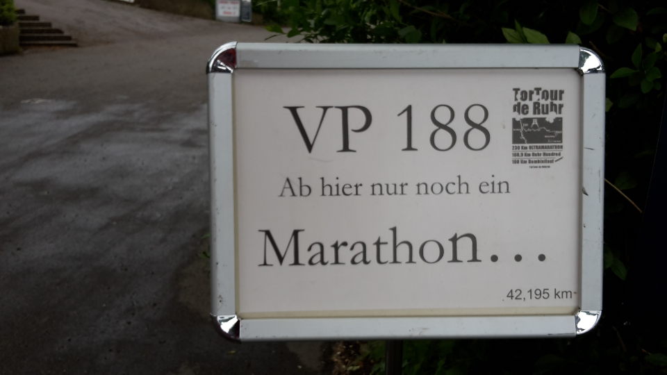 | 15.05. | Gegen 2:00 Uhr erreiche ich den Checkpoint VP130 am Hengsteysee. Hier startet um 4:00 Uhr der 100km Bambinilauf. Auch hier möchte ich mich nur kurz aufhalten. Ein wenig essen und ein bisschen was erledigen. Ganz nette Helfer bringen mir ein wenig Essen an den Tisch. Man kümmert sich hier wieder besonders nett um die Läufer. Oder nur um mich, weil ich schon ziemlich besch..... aussehe? Nee, ich glaube nicht. Nach 20 Minuten mache ich mich wieder auf den Weg. Da ich so unglaublich müde bin, setze ich beim Herausgehen noch kurz an einen Tisch. 5-Minuten die Augen zumachen, das reicht vermutlich schon. Erst finde ich keine Ruhe, aber plötzlich bin ich doch weg. 15 Minuten später wache ich auf. Viel Zeit ist vergangen. Jetzt aber hopp nach draußen. Bestimmt 40 Minuten habe ich hier "verloren".