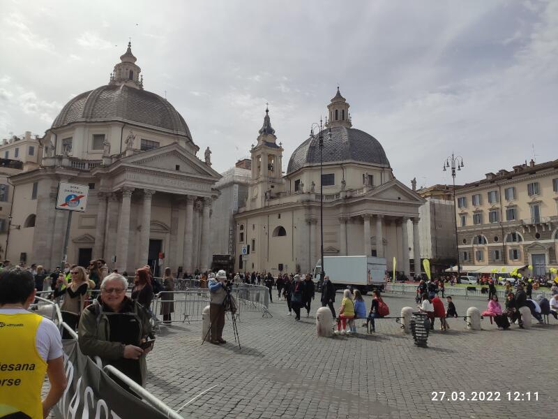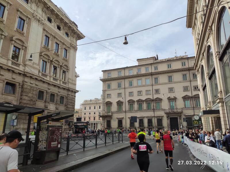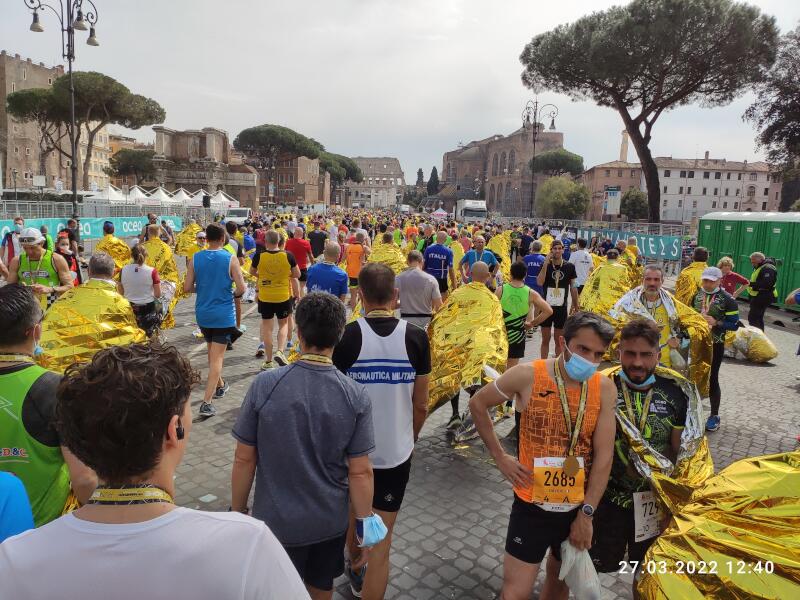 Am Samstag nach dem Frühstück, Abholung der Startunterlagen im "Salone delle Fontane", einem Veranstaltungszentrum am Stadtrand. Als Add-On gibt es auch noch die Medaille von 2020 für alle, die schon damals angemeldet waren. Danach werden, bei diversen Besichtigungen (Colosseum u.v.a.m.), noch ein paar Kilometer gefressen. Am Abend endlich mal wieder Pizza. Sonntag, endlich wieder Marathontag. Wegen der angekündigten Sicherheitskontrollen mache ich mich schon gegen 7:45 Uhr auf den Weg zum Start, der um 8:35 Uhr geplant ist. Um Eingang zum Startgebiet zu erlangen, muss ich leider erstmal halb um das Colosseum herum laufen, um den Weg dann wieder, nun innerhalb der Absperrung, zurück zu latschen.