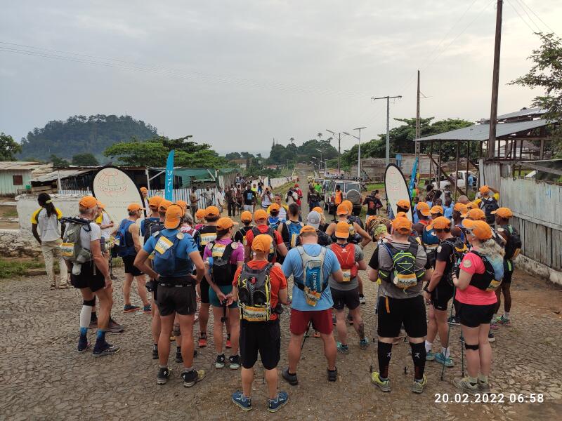 Nach dem offiziellen Startfoto, einer Ansprache des Sportministers von São Tomé und Príncipe, Herrn Vinicio Pina und dem Singen der Nationalhymne durch einheimische Schulkinder, geht es um 7:15 Uhr auf die 1. Etappe.