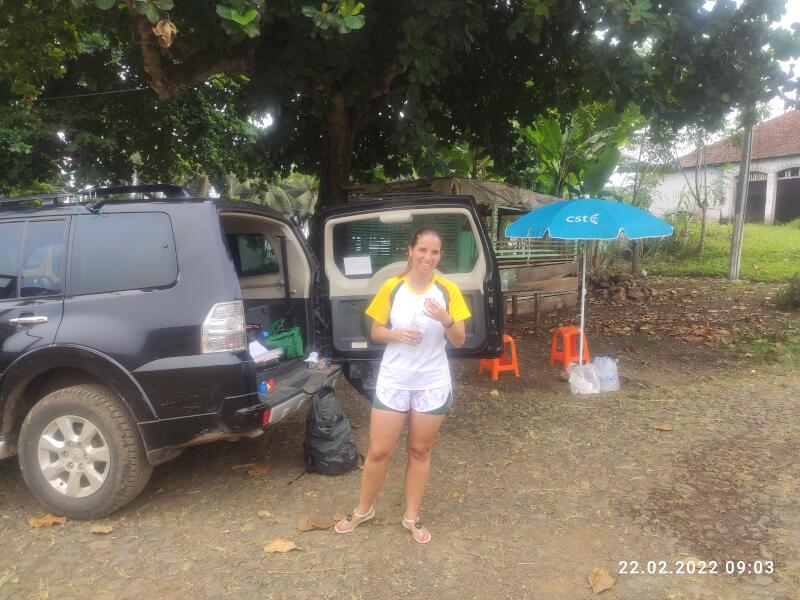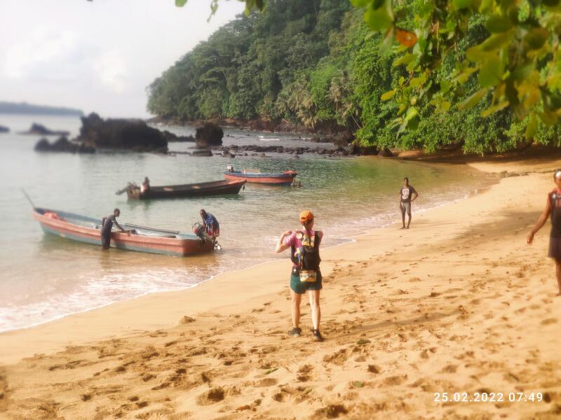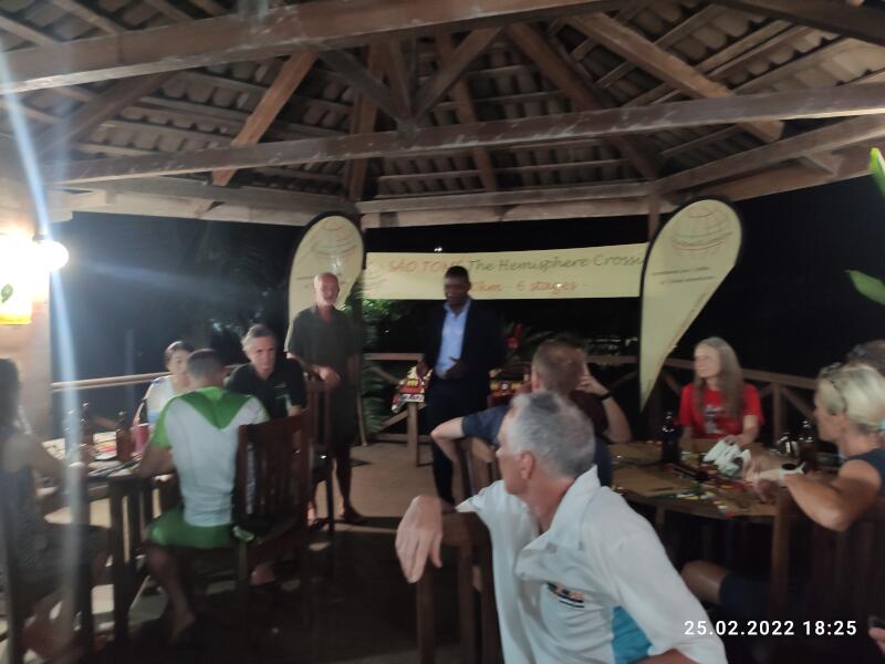 Der CP1 ist wieder in ca. 10 km Entfernung, wieder an einem schönen Strand gelegen. Hier wird die Zeit gestoppt und sobald 8 Läufer angekommen sind, bringt sie ein Bötchen in wenigen Minuten auf die kleine, São Tomé vorgelagerte Insel "Ilhéu das Rolas". Bis zum Strand war ich eigentlich ganz gut drauf. Als es aber nach der Überfahrt weiter gehen soll, wollen meine Beine irgendwie nicht mehr so richtig. Die sind wohl auf der Überfahrt eingerostet. Da sich aber ranglistenmäßig eh nichts mehr groß auf diesem allerletzten Stück ändern kann, ist mir das noch mehr egal als sonst. Ob ich nun 5 Minuten schneller oder langsamer bin, interessiert keinen. Es geht jetzt einmal 5 km um die Insel drumrum, zumeist durch Kokosplantagen, deren Grund mit Kokosnussschalen übersät ist. Das ist kein einfaches Laufen oder Gehen hier. Die letzten 200 Meter geht es nochmal einen steilen Weg hinauf. Dann ist endlich das Ziel auf einem kleinen Platz direkt auf dem Äquator erreicht. Manche Erzählungen sagen auch, dass man hier genau an dem Punkt sein soll, an dem der Äquator den nullten Längengrad, also den Nullmeridian, schneidet. Forscht man diesbezgl. aber ein wenig nach, war das aber vermutlich wohl nur früher so, als man noch nicht so präzise messen konnte. Der exakte Nullmeridian schneidet den Äquator 6 Grad oder ca. 700 Kilometer weiter westlich, irgendwo im Atlantik. So oder so, das ist ein ganz wichtiger Ort hier. Ein "must gewesen sein" sozusagen. Durch den versetzten Start trudeln in der nächsten Stunde alle Teilnehmer ein. Es gibt für jeden eine frische Kokosnuss als Finisher Verpflegung, bevor die ganze Gesellschaft gemeinsam zurück zum Bootsanleger geht. Kurz danach wieder mit dem Boot zurück nach São Tomé und in die, hinter dem Strand gelegene Praia Inhame Eco Lodge. Jetzt ist endgültig nur noch chillen angesagt. Am Abend die schöne Siegerehrung mit fettem Buffet.