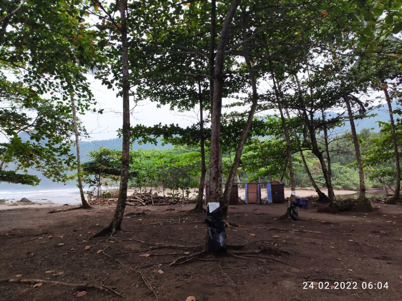 Der Start zur vorletzten Etappe ist, nach der langen Etappe gestern, erst um 7:00 Uhr. Da, wie in den letzten Tagen, wieder Brötchen zur Verfügung gestellt werden, entsorge ich nun komplett meine selbst zusammengebastelte Kornflakes- Haferflocken-Trockenmilch Pampe. Kurz nach dem Start kommt man wieder in Aussichtspunkt Entfernung an dem wichtigen Felsen vorbei. Dann muss schon bald ein schmaler, steiler und glitschiger Dschungelpfad heraufgekraxelt werden. Ziemlich anstrengend und kräftezehrend. Ich bin heilfroh, dass am Ende des Weges nicht ein ähnlicher Pfad wieder zurück gestolpert werden muss, sondern eine "normale" Straße wieder herunterführt. Dann geht es über unterschiedlichste Untergründe weiter, bis nach 28 Kilometern das letzte Camp an dem sehr schönen Sandstrand Praia Piscina erreicht ist.