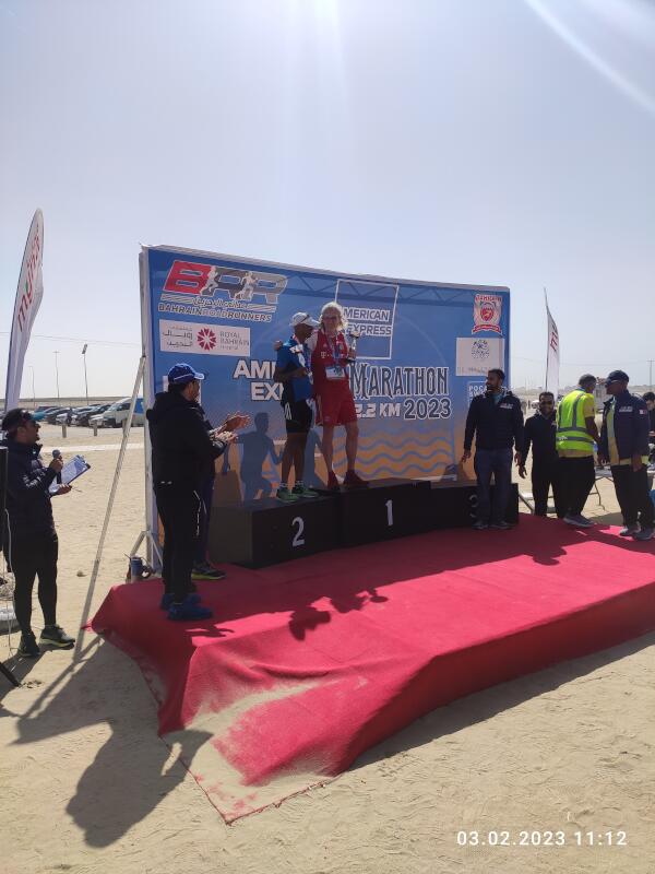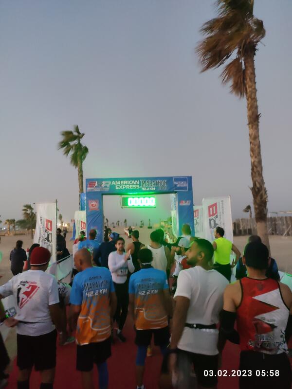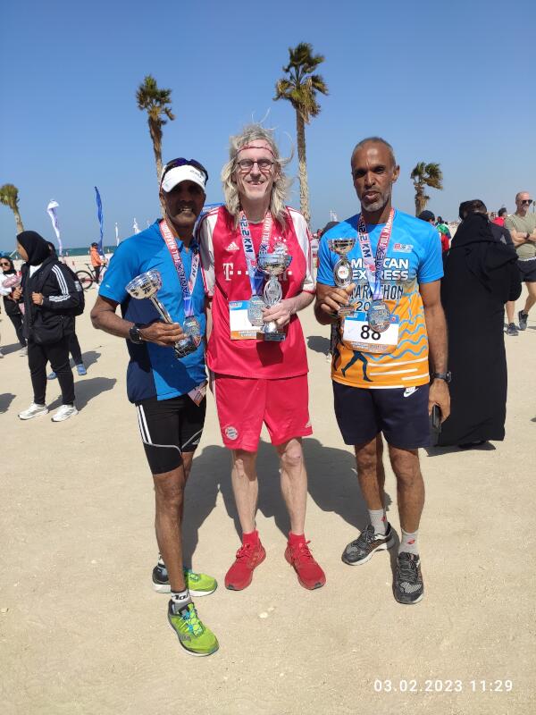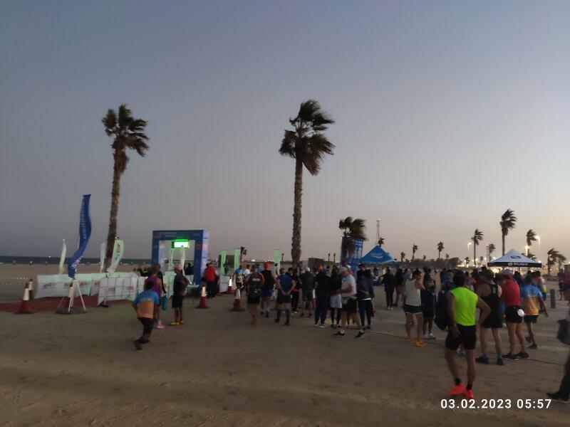 Fast pünktlich um 6 Uhr geht es los. Zunächst eine 1,5 km Runde auf dem Strand, dann auf die Küstenstraße für das erste Straßenstück. Der Wind kommt von hinten, das ist sehr gut. Ich komme, wie ja eigentlich immer zu Beginn, gut voran. Nur spüre ich leider schon nach ein paar Kilometern meine Oberschenkel. Oh, oh, wenn das mal gut geht. Nach ca. 9 Kilometern ein Roundabout und es geht wieder zurück. Nun kommt der Wind von vorne. Kein Lüftchen, sondern übel stark. Sub 4 Stunden kann ich damit knicken. Javed, ein indischer Kollege der aber schon lange in Bahrain lebt, läuft auf mich auf. Wir unterhalten uns ein wenig und er fragt mich bald nach meinem Alter. Schnell ist klar, er ist mit 63 Jahren in meiner Altersklasse. Also ein direkter "Konkurrent" auf eine AK-Trophäe. Hoffentlich wird das jetzt nicht stressig. Wir unterhalten uns ganz nett und die Zeit vergeht dadurch recht schnell. Dann geht es auf die nächste Strandrunde. Einmal rechts herum. Der Halbmarathon ist geschafft. 2:03:54 Stunden. Bei dem Wind und den 70 Kilometern vom letzten Sonntag ist das ok.