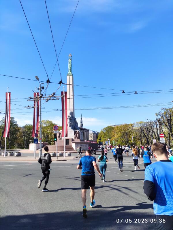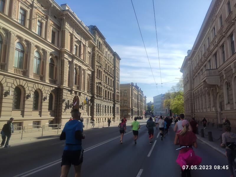 Nun, nachdem "die Halben" weg sind, ist es vergleichsweise einsam auf der Strecke. Kein Wunder, denn nur ca. jeder Vierte ist "ein Voller". Bis Kilometer 34 läuft es richtig gut. Viele kann ich mit meinem gleichmäßigen Tempo einholen. Dann werde ich stetig langsamer und bei Kilometer 37 geht gar nichts mehr. Eine Zeit unter 3:50 Stunden kann ich knicken. Aber zumindest unter 4 Stunden möchte ich dann doch noch gerne bleiben. Ich muss zwar nicht gehen, aber meine Lauferei ist so langsam und mühsam, dass es sich wie gehen anfühlt. Viele, die ich ich zwischen Kilometer 20 und 33 überholt habe, laufen jetzt wieder an mir vorbei. Das ist ein wenig deprimierend. Aber was soll's. Ich möchte nur wenigstens unter 4 Stunden bleiben. Dann endlich, die über ein Kilometer lange Zielgerade entlang des flusses Düna. Nach 3:53:55 Stunden schleppe ich mich durch's Ziel. Mit der Zeit kann ich ja eigentlich noch ganz zufrieden sein wenn man bedenkt, wie bescheiden es mir noch vor ein paar Stunden ging.